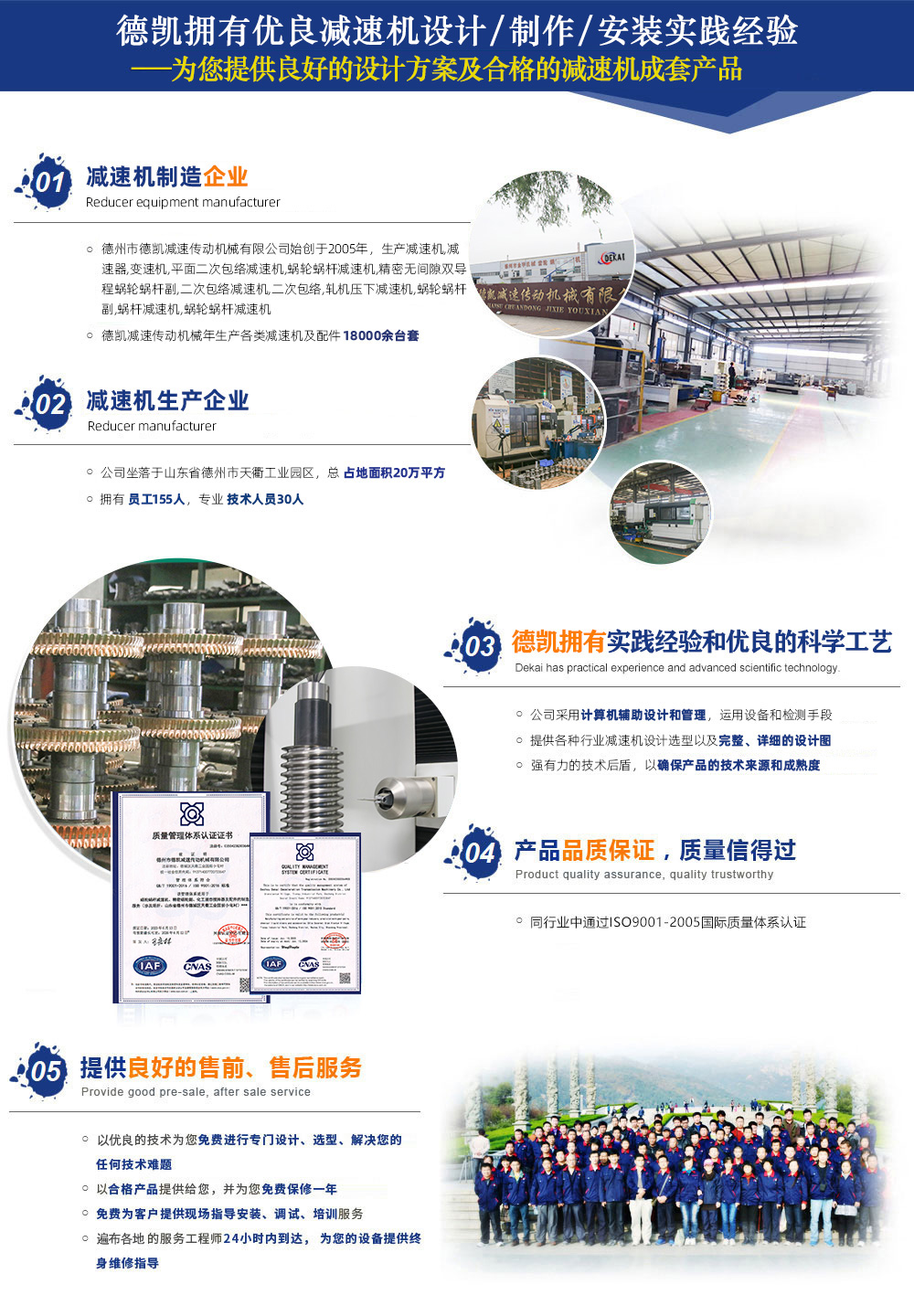 德州市德凱減速傳動機械有限公司,生產減速機,減速器,變速機,平面二次包絡減速機,蝸輪蝸桿減速機,精密無間隙雙導程蝸輪蝸桿副,二次包絡減速機,蝸輪蝸桿,軋機壓下減速機,蝸輪蝸桿副,蝸桿減速機,蝸輪蝸桿減速機,公司占地面積20萬平方,員工155人,技術人員30人,年生產各類減速機及配件18000余臺套。在同行業中通過了ISO9001質量管理體系認證。公司設備齊全、技術力量強大、檢測手段完善,引進國外大型數控二次包絡機床GJK75加工數控4臺,可加工到800二次包絡蝸輪蝸桿。引進漢江S7732蝸桿磨床3臺,精度可達5級。公司擁有輝光離子氮化爐4臺,經該設備氮化后可提高蝸桿表面硬度、耐磨性高、提高疲勞強度、變形量小、耐蝕性、...