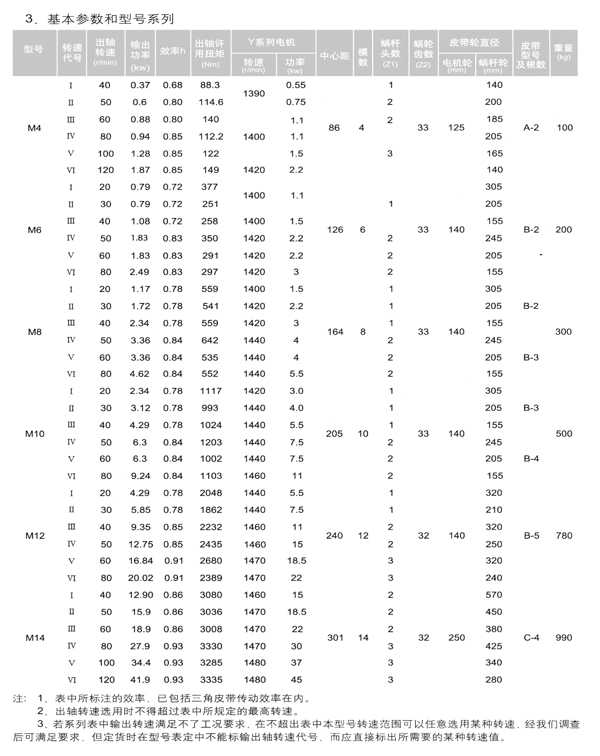1.1本系列減速機二級減速傳動機構,一級為帶傳動,第二級為阿基米德圓柱蝸桿蝸輪傳動。其特點有:結構緊湊傳動比大、工作平穩(wěn)可靠、無噪音、在蝸桿螺線導程角小的情況下減速機還具有自鎖性。