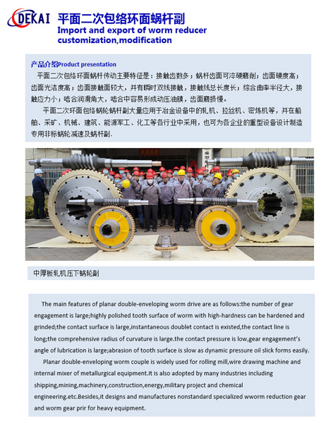 輪胎定型硫化機平面包絡環面蝸桿減速機產品特點:由于采用平面包絡環面蝸桿傳動,與其它蝸桿傳動相比,具有如下特點:承載能力大;結構緊湊;傳動效率高;運行平穩,噪音低,使用壽命長。